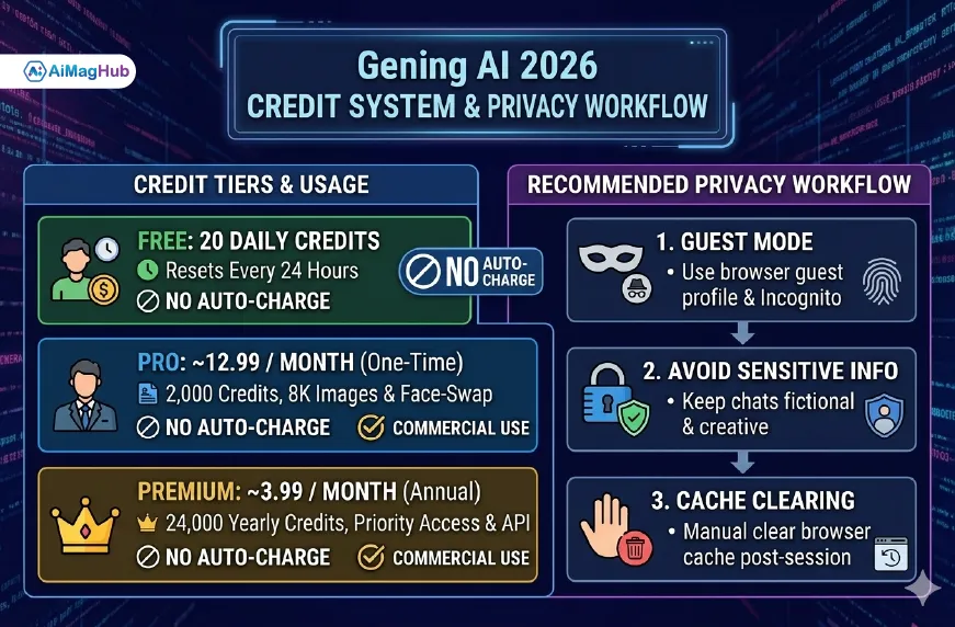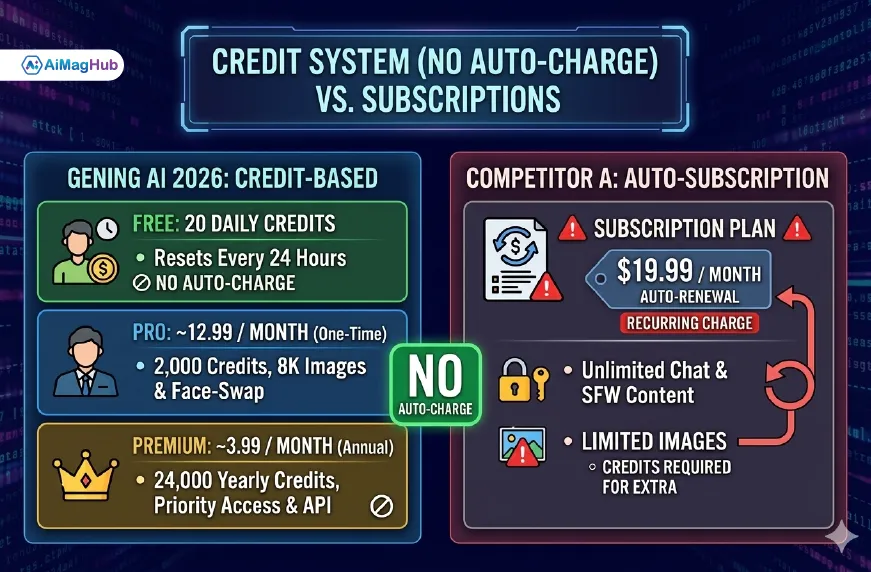 Gening AI uses a credit-based system instead of forcing subscriptions — which is actually a big advantage.